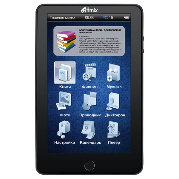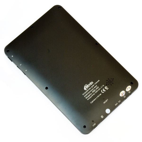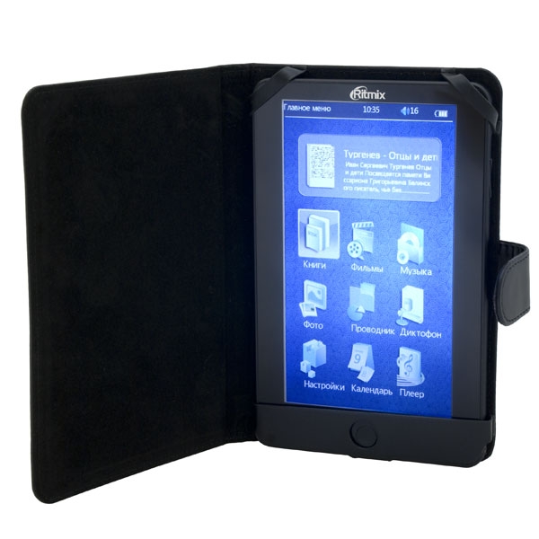 Электронная книга Ritmix RBK-450 - технология экрана - TFT, диагональ - 7 дюймов, разрешение - 800х480 пикселей. Разъём для карт памяти - micro SD (TF) карты (до 16 Гб, только class 4). Поддерживает такие форматы книг как: TXT, HTML, FB2, EPUB, PDF, PDB, CHM; изображения:JPEG, BMP, GIF, PNG. Воспроизводит музыку и видео в форматеRM, RMVB, AVI, MP4, MPG, FLV, MOV, 3GP, VOB, DAT, ASF, MP3, WMA, WAV, OGG, AAC, FLAC, APE. В комплект входит -чехол, USB-кабель, зарядное устройство, наушники, инструкция.